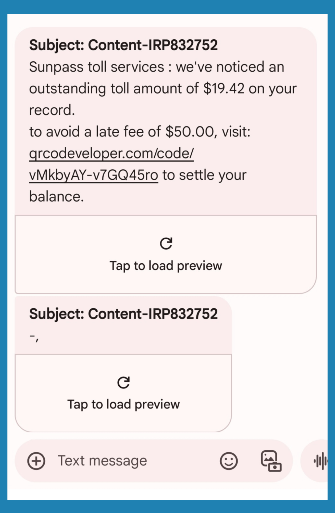 A few months back I started receiving test about unpaid tolls. I had not been traveling, so I knew right away it was a scam. I started hearing more and more people mentioning it. You may have received a text claiming you owe money for unpaid tolls, be cautious—it’s likely a scam. Scammers are impersonating toll agencies nationwide, sending fraudulent messages demanding payment.